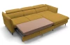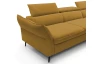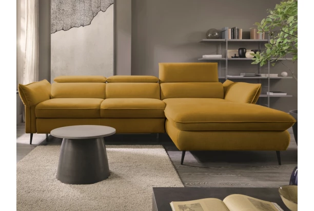 Rohová sedací souprava v trendovém elegantním designu připomíná optiku polštářů. Komfortní sezení doplňují polohovatelné zádové opěrky a nastavitelné boční područky, díky kterým si přizpůsobíte pohodlí podle aktuální potřeby. Sedačka tvořící pravý roh je očalouněna sametově lesklou měkkou látkou v odstínu hořčicová žlutá. Praktickou stránkou je rozkládací funkce na lůžko a úložný prostor, který se vždy hodí.
