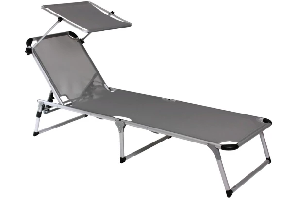 Zahradní lehátko s polohování části hlavy a polohovacím stínítkem. Praktická skládací konstrukce z kombinace kovu a šedé umělé tkaniny.