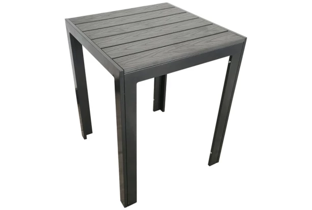 Čtvercový zahradní stůl z antracitového kovu a umělé imitace šedého dřeva má pevnou konstrukci a je praktický pro jeho snadnou údržbu ve venkovním prostředí. Díky rozměru jídelní plochy 60×60 cm je ideální také do velmi malého prostoru.