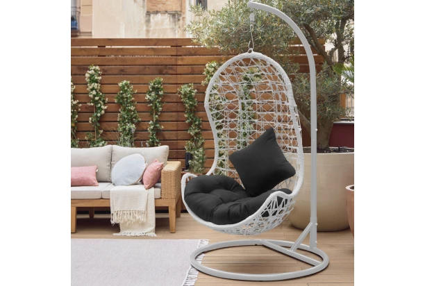 Závěsné houpací křeslo pro chvíle pohody při příjemném houpání. Zakulacený sedák z bílého umělého ratanu doplňuje sedací a opěrný polštář. Skvěle doplní nejen venkovní zahradu, ale třeba i interier.