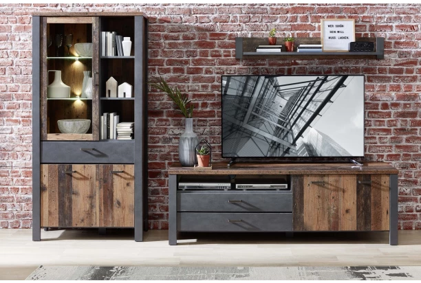 Vysoká vitrínová skříň s osvětlením z kolekce Cardiff – exkluzivní optika v městském industriálním stylu v kombinaci imitace broušeného kovu s vintage optikou dřevěných prken. Snadno si tak zařídíte interier, který bude nejen praktický, ale i zajímavý na pohled.