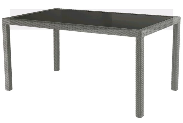 Obdélný zahradní stůl o rozměru 150×90 cm je vyroben z kombinace kovu, tvrzeného skla a odolné imitace šedo-hnědého ratanu.