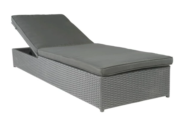 Moderní zahradní lehátko s polohovatelným opěradlem je vybaveno polštářem pro komfortně měkké ležení. Vyrobeno z kovu a odolné imitace šedo-hnědého ratanu.