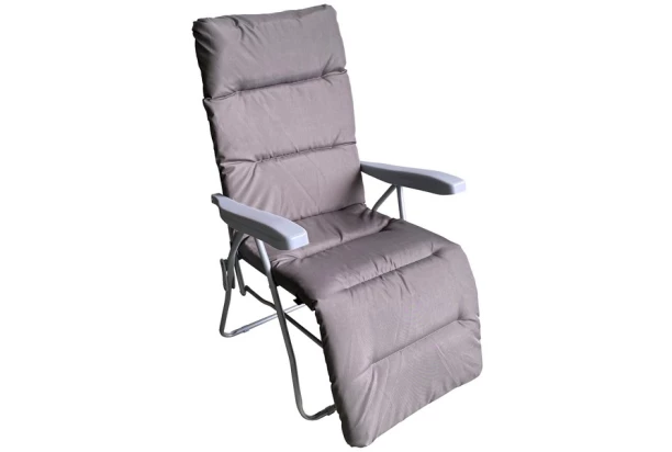 Polohovatelné zahradní křeslo s područkami pro příjemné chvíle relaxace. Stabilní kovovou konstrukci doplňuje měkký látkový polštář v šedém odstínu. Křeslo lze nastavovat až do 7 poloh – poslouží tedy nejen u zahradního stolu, ale i například ke slunění ve sklopené relaxační poloze.