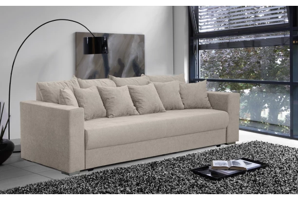 Prostorná pohovka se spoustou opěrných polštářů, díky kterým si přizpůsobíte pohodlí podle potřeby. Pohovka je očalouněna látkou v odstínu béžová. Vybavena rozkládací funkcí na lůžko, jež lze využít i pro trvalé spaní. Velkou lehací plochu 160×200 cm doplňuje komfortní pěnový topper, který snadno uschováte do objemného úložného prostoru pod sedákem.