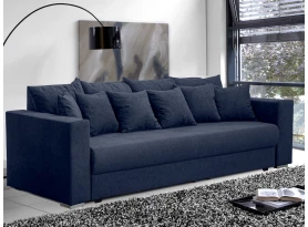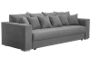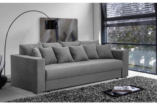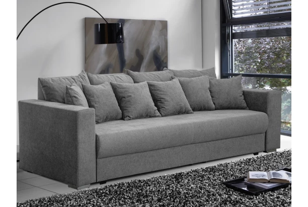 Prostorná pohovka se spoustou opěrných polštářů, díky kterým si přizpůsobíte pohodlí podle potřeby. Pohovka je očalouněna látkou v odstínu středně šedá. Vybavena rozkládací funkcí na lůžko, jež lze využít i pro trvalé spaní. Velkou lehací plochu 160×200 cm doplňuje komfortní pěnový topper, který snadno uschováte do objemného úložného prostoru pod sedákem.
