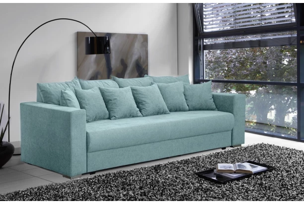 Prostorná pohovka se spoustou opěrných polštářů, díky kterým si přizpůsobíte pohodlí podle potřeby. Pohovka je očalouněna látkou v odstínu modrá aqua. Vybavena rozkládací funkcí na lůžko, jež lze využít i pro trvalé spaní. Velkou lehací plochu 160×200 cm doplňuje komfortní pěnový topper, který snadno uschováte do objemného úložného prostoru pod sedákem.