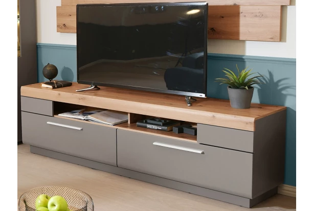 TV skříňka z kolekce Lucera – moderní trendový nábytek pro zařízení útulného obývacího prostoru. Příjemná kombinace dřevodekoru dub artisan se šedými plochami vypadá skvěle a vytvoří příjemné domácí prostředí.