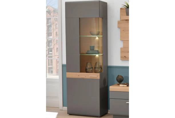Vysoká vitrína Lucera, dub artisan/šedá, s osvětlením