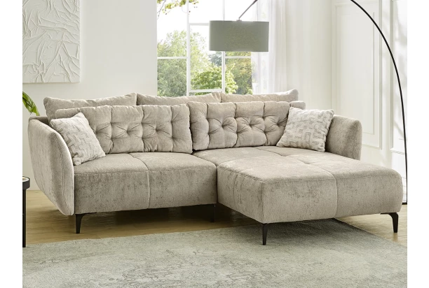 Elegantní rohová sedací souprava s množstvím opěrných polštářů pro váš každodenní komfort. Měkkou žinilkovou látku v barvě béžová zvýrazňuje atraktivní prošití a malé šedé polštářky s moderním vzorem. Díky kovovým nožkám je sedačka stabilní a zároveň umožňuje snadnou údržbu podlahy. Prostorný otoman je možné libovolně umístit na pravou anebo levou stranu sedačky a vytvořit si tak pravý anebo levý roh – sedačka tak bude snadno pasovat téměř do jakéhokoliv prostoru obýváku. Po odejmutí všech polštářů získáte komfortní plochu, kde můžete pohodlně relaxovat anebo příležitostně přespat. Plochu sedačky můžete individuálně navíc zvětšit po přisunutí doplňkového taburetu.