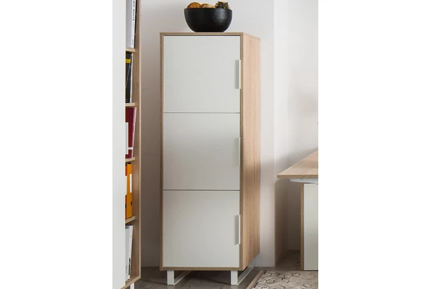 Vysoká 3-dveřová skříňka z kolekce Home Office – kvalitní český nábytek pro zařízení moderní domácí kanceláře, pracovny, případně jakékoliv místnosti vašeho bytu. Z jednotlivých dílů lze snadno vytvořit prostředí plné ergonomie podle vašich aktuálních potřeb. Nábytek v kombinaci dekoru dub sonoma/bílá/bílý kov je moderním a zároveň nadčasovým řešením.
