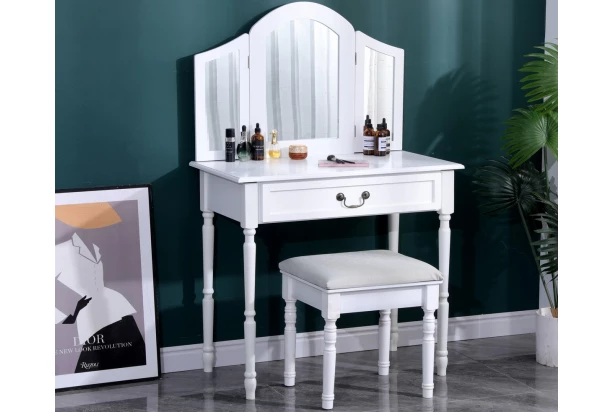 Bílý kosmetický stolek se stoličkou v romantickém stylu skvěle doplní atmosféru ložnice. Stolek obsahuje trojdílné zrcadlo i zásuvku, kam můžete ukládat šperky, doplňky nebo kosmetiku.