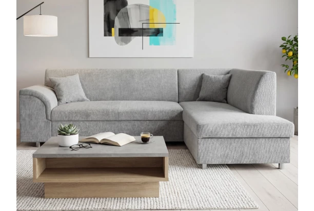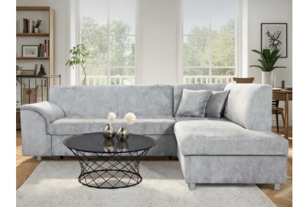 Elegantní rohová sedačka se zaoblenou područkou pasuje do klasického i moderního obýváku. Sedačka je vybavena rozkládací funkci i úložným prostorem pod otomanem, se kterým tvoří pravý roh. Očalouněna měkce strukturovanou látkou v barvě melírová holubí šedá.