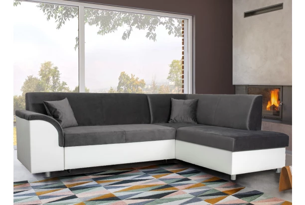 Rohová sedací souprava se zaoblenou područkou, pravým otomanem, rozkládací funkcí a úložným prostorem. Očalouněna kombinací bílá ekokůže/tmavě šedá látka. Elegantní tvary sedačky pasují do každého bytu.