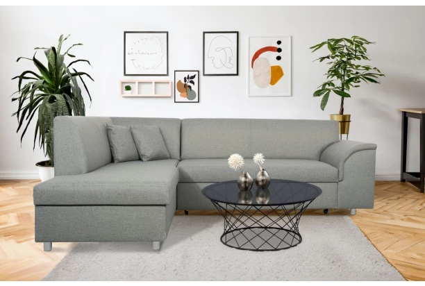Rohová sedací souprava se zaoblenou područkou, levým otomanem, rozkládací funkcí a úložným prostorem. Očalouněna tkaninou v barvě světle šedá. Elegantní tvary sedačky pasují do každého bytu.