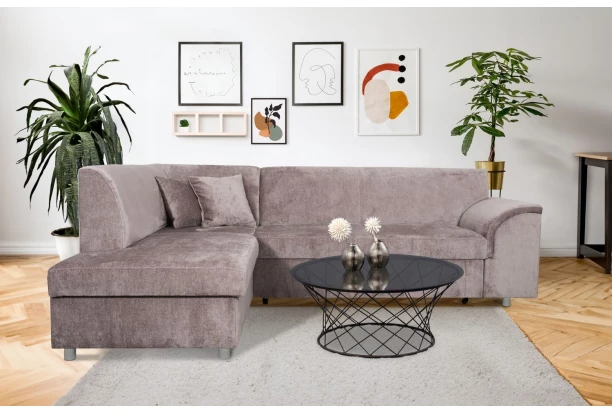 Rohová sedací souprava se zaoblenou područkou, levým otomanem, rozkládací funkcí a úložným prostorem. Očalouněna měkce strukturovanou látkou v barvě růžová. Elegantní tvary sedačky pasují do každého bytu.