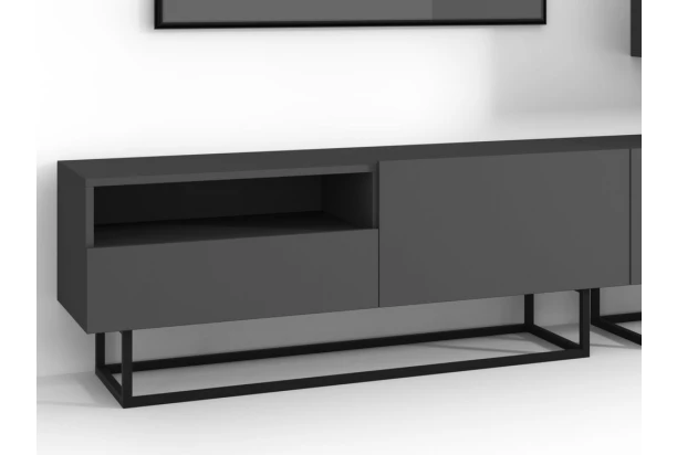 TV skříňka se zásuvkou v grafitovém provedení z programu Enjoy – inspirujte se městským industriálním stylem a buďte prostě in. Nábytek na černé podnoži zaujme nevšední optikou a zároveň působí velmi vzdušně. Skříňku můžete využít buď s podnoží anebo i bez ní a zavěsit ji tak jednoduše na stěnu.