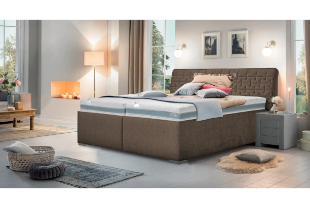 Elegantní dvoulůžková postel o velikosti 180×200 cm zaujme geometricky prošívaným čelem, které působí útulně a trendy. Očalouněna příjemně měkkou látkou v barvě hnědá. Postel je vybavena lamelovými rošty s funkcí polohování a objemnými úložnými prostory, do kterých můžete uložit třeba lůžkoviny anebo sezónní věci.