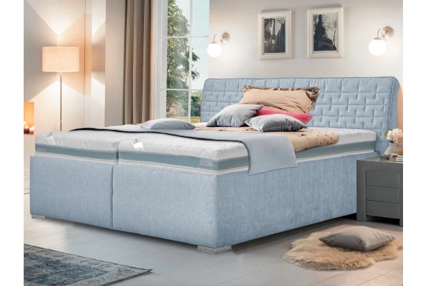 Elegantní dvoulůžková postel o velikosti 180×200 cm zaujme geometricky prošívaným čelem, které působí útulně a trendy. Očalouněna příjemně měkkou látkou v barvě pastelová světle modrá. Postel je vybavena lamelovými rošty s funkcí polohování a objemnými úložnými prostory, do kterých můžete uložit třeba lůžkoviny anebo sezónní věci.