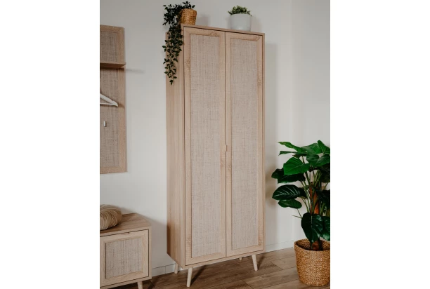 Předsíňová skříň nebo také botník z kolekce Bali – vytvořte si útulný a zároveň krásně zařízený domov v přírodním stylu. Atraktivní nábytek ve světlých tónech dřevodekoru dub sonoma spolu s úžasnou imitací lýkového výpletu dodá vašemu interieru příjemně hřejivou atmosféru. Stylový přírodní design nábytku podtrhují masivní dřevěné nožky, díky nimž můžete snadno udržovat podlahu v bytě.