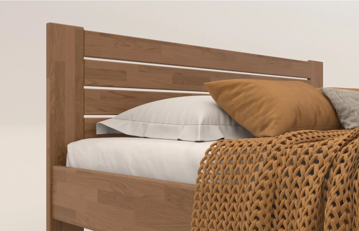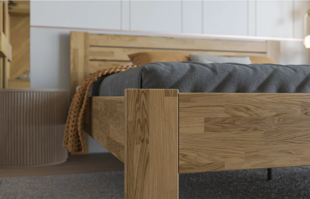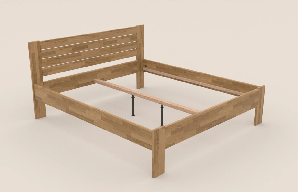 - rohové spoje postelového rámu: tradiční a velice pevné rohové spojení systémem závrtné matice a šroubového táhla s přídavnými kolíky – takové rohové spojení u celomasivní postele lze právem považovat za nejpevnější a nejodolnější vůči dynamickému zatížení postele