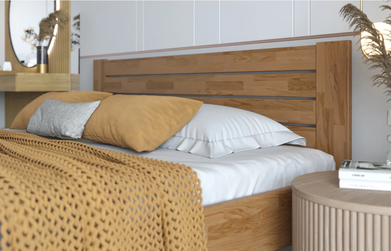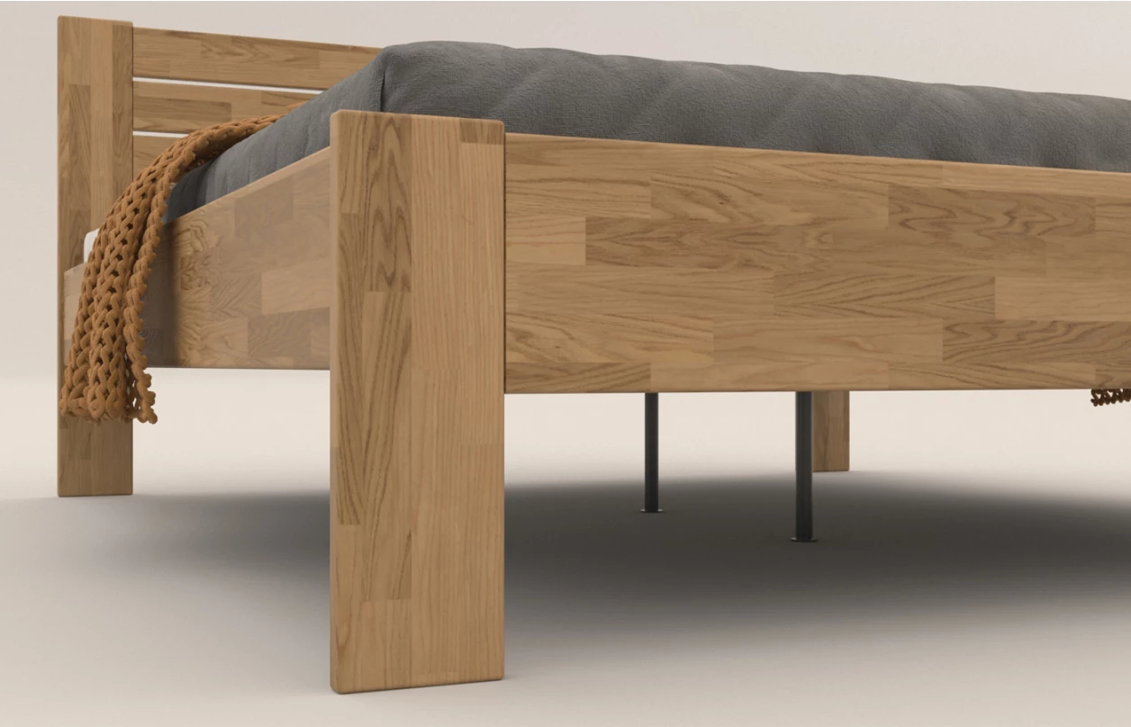 - rohové spoje postelového rámu: tradiční a velice pevné rohové spojení systémem závrtné matice a šroubového táhla s přídavnými kolíky – takové rohové spojení u celomasivní postele lze právem považovat za nejpevnější a nejodolnější vůči dynamickému zatížení postele
