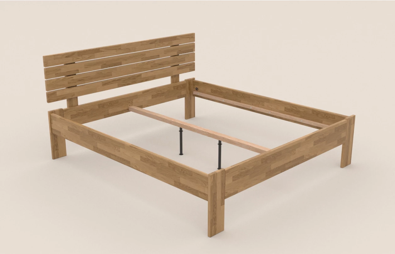 - rohové spoje postelového rámu: tradiční a velice pevné rohové spojení systémem závrtné matice a šroubového táhla s přídavnými kolíky – takové rohové spojení u celomasivní postele lze právem považovat za nejpevnější a nejodolnější vůči dynamickému zatížení postele