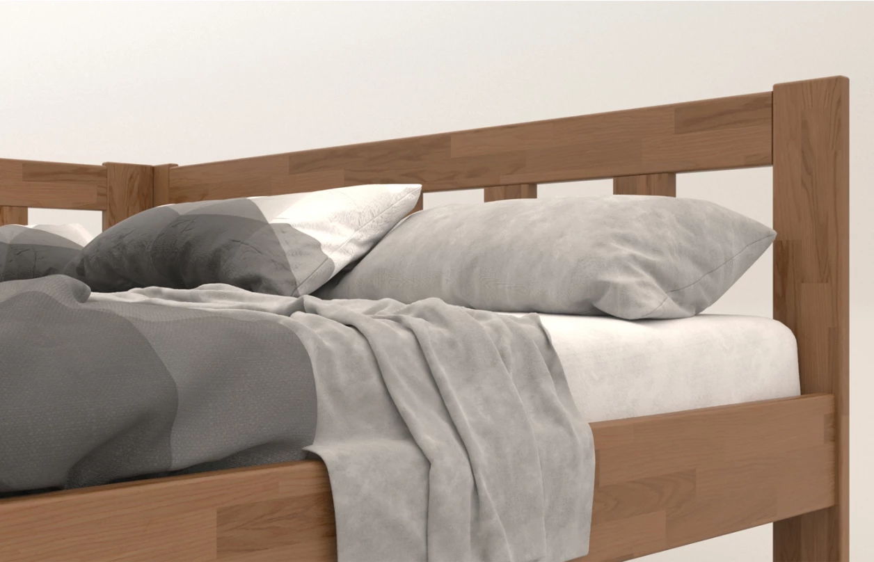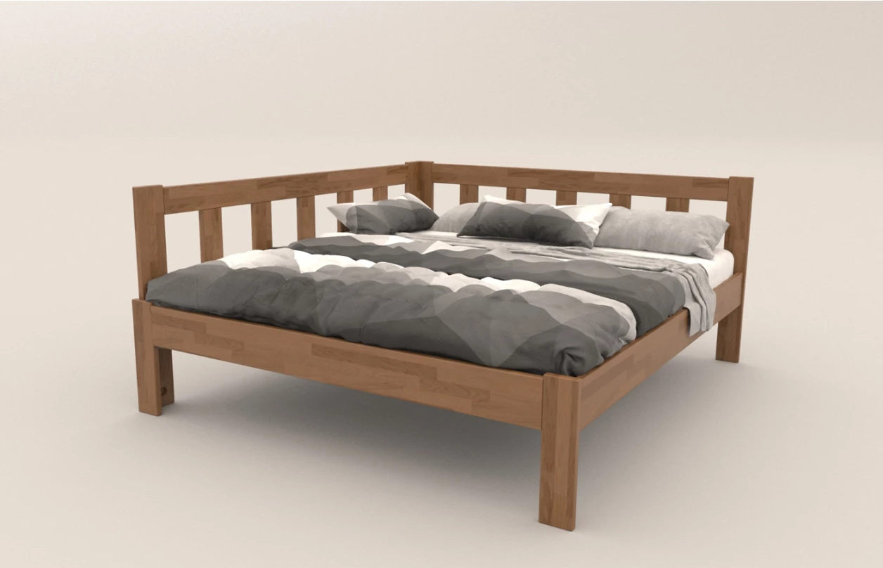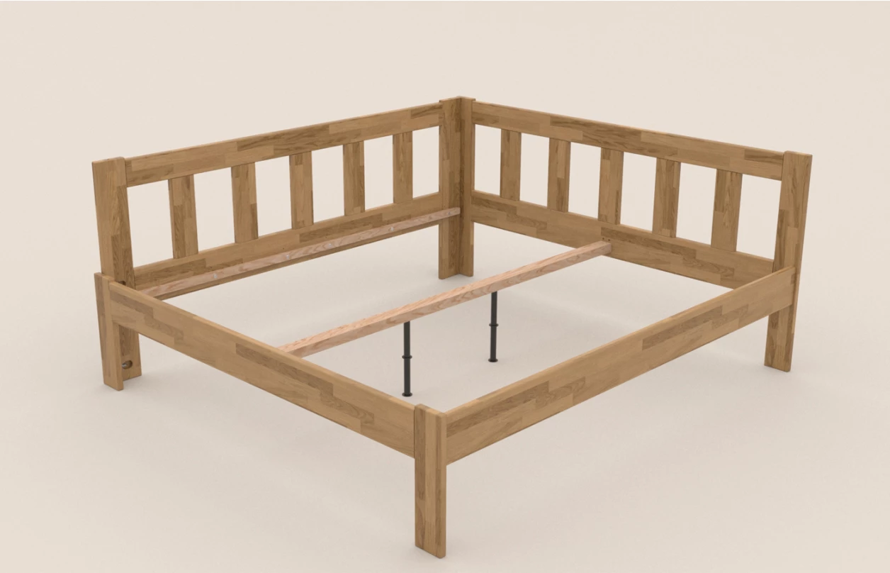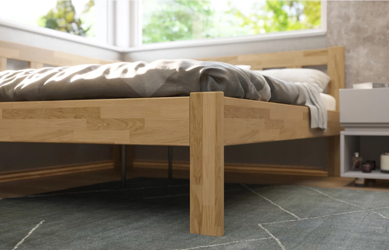 - rohové spoje postelového rámu: tradiční a velice pevné rohové spojení systémem závrtné matice a šroubového táhla s přídavnými kolíky – takové rohové spojení u celomasivní postele lze právem považovat za nejpevnější a nejodolnější vůči dynamickému zatížení postele