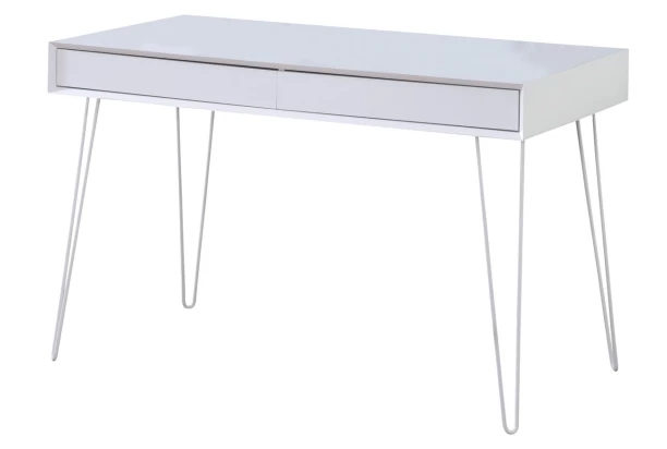Bílý psací stůl v moderním designu zaujme na pohled zajímavě zkosenými hranami a kovovou podnoží, díky které působí v interieru vzdušně. Nabízí dvě praktické zásuvky pro ukládání psacích potřeb, knížek nebo třeba laptopu.