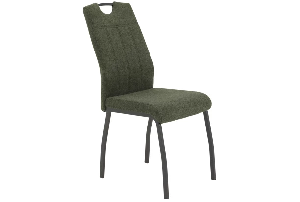 Moderní jídelní židle na antracitové kovové podnoži je doplněna praktickým kovovým madlem pro snadnou manipulaci při odsouvání od stolu. Pohodlně polstrovaná židle je očalouněna látkou v barvě zelená a doplněna proševem.