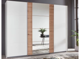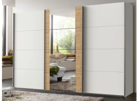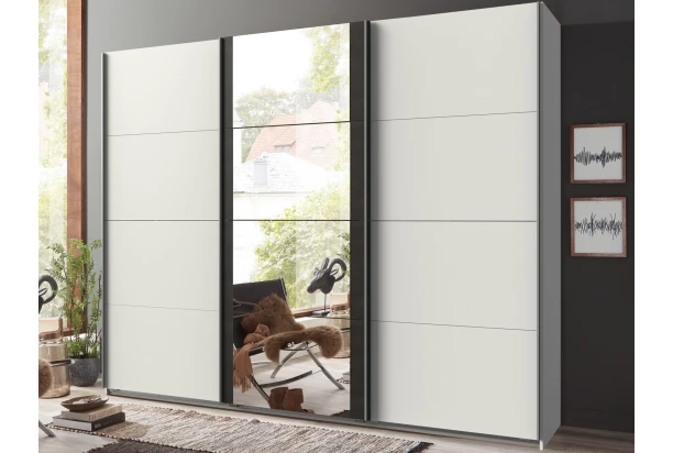 Šatní skříň o šířce 225 cm a standardní výšce 208 cm se 3 posuvnými dveřmi nabízí praktické členění vnitřního prostoru se 2 šatními tyčemi a 2 policemi pro přehledné ukládání oblečení, prostor lze snadno doplnit dalšími policemi. Bílé plochy skříně doplňuje imitace antracitové broušené oceli se zrcadlem uprostřed.