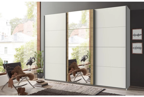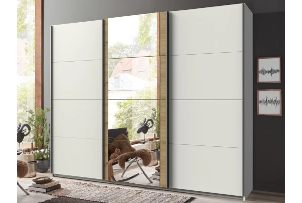 Šatní skříň o šířce 225 cm a standardní výšce 208 cm se 3 posuvnými dveřmi nabízí praktické členění vnitřního prostoru se 2 šatními tyčemi a 2 policemi pro přehledné ukládání oblečení, prostor lze snadno doplnit dalšími policemi. Bílé plochy skříně doplňuje dřevodekor dub artisan se zrcadlem uprostřed.