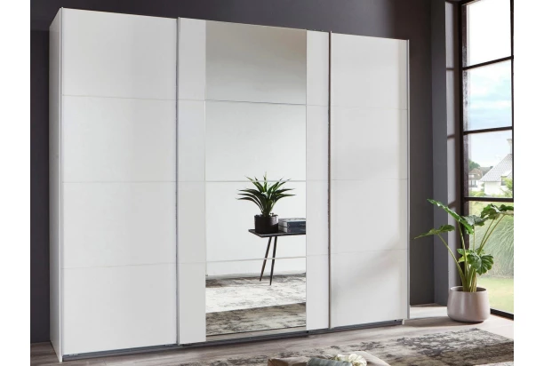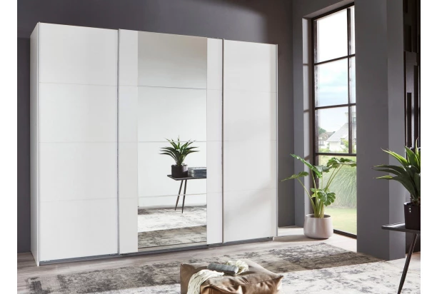Šatní skříň o šířce 225 cm a standardní výšce 208 cm se 3 posuvnými dveřmi nabízí praktické členění vnitřního prostoru se 2 šatními tyčemi a 2 policemi pro přehledné ukládání oblečení, prostor lze snadno doplnit dalšími policemi. Tato bílá skříň je doplněna zrcadlem uprostřed.