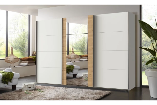 Šatní skříň o šířce 313 cm a standardní výšce 208 cm se 3 posuvnými dveřmi nabízí praktické členění vnitřního prostoru se 3 šatními tyčemi a 3 policemi pro přehledné ukládání oblečení, prostor lze snadno doplnit dalšími policemi. Bílé plochy skříně doplňuje dřevodekor dub artisan se zrcadlem uprostřed.