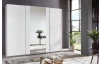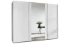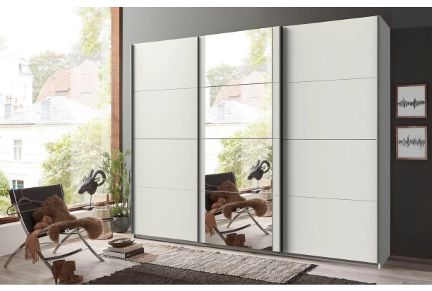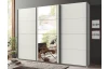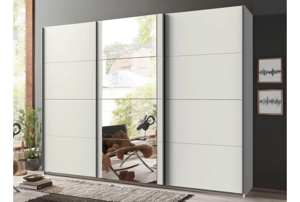 Šatní skříň o šířce 270 cm a standardní výšce 208 cm se 3 posuvnými dveřmi nabízí praktické členění vnitřního prostoru se 3 šatními tyčemi a 3 policemi pro přehledné ukládání oblečení, prostor lze snadno doplnit dalšími policemi. Tato bílá skříň je doplněna zrcadlem uprostřed.