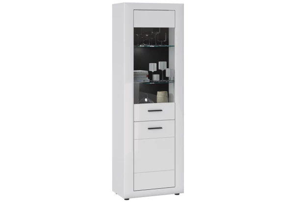 Vysoká vitrína z programu Colmar – bílý nábytek s lesklými předními plochami, černými úchyty a širokými rámy osloví všechny, kdo mají rádi klasický moderní styl a čisté rovné linie.