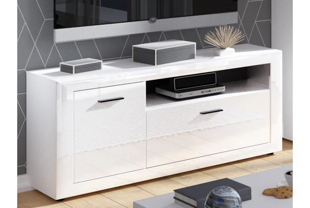 TV skříňka o šířce 156 cm z programu Colmar – bílý nábytek s lesklými předními plochami, černými úchyty a širokými rámy osloví všechny, kdo mají rádi klasický moderní styl a čisté rovné linie.