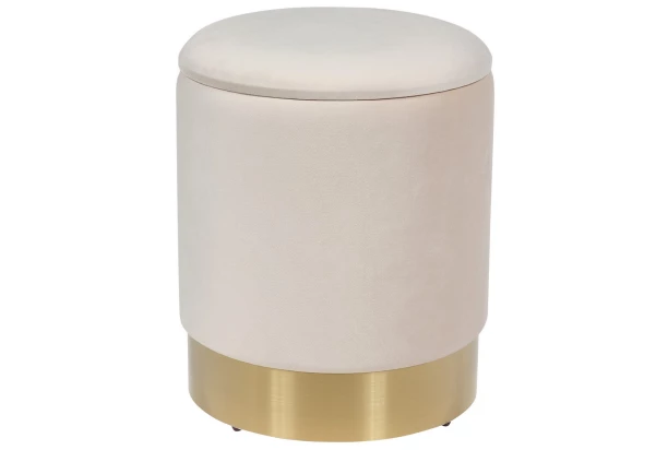 Kulatý taburet se zlatým podstavcem a vnitřním úložným prostorem je nejen praktickým, ale i stylovým doplňkem do trendového bytu. Očalouněn příjemnou sametovou látkou v barvě krémová.