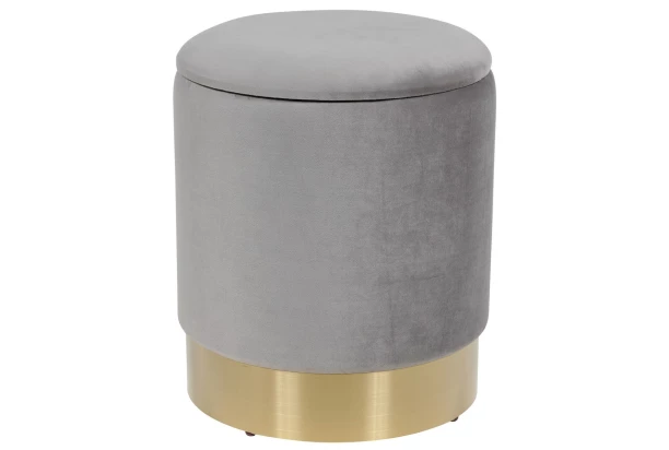 Kulatý taburet se zlatým podstavcem a vnitřním úložným prostorem je nejen praktickým, ale i stylovým doplňkem do trendového bytu. Očalouněn příjemnou sametovou látkou v barvě světle šedá.