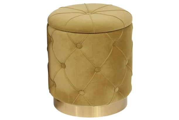 Taburet v noblesním glamour vzhledu je očalouněn sametovou látkou v barvě žlutá kari. Stylový design podtrhují okrasné knoflíky a zlatý kovový podstavec. U taburetu oceníte také praktický úložný prostor ukrytý pod sedákem.