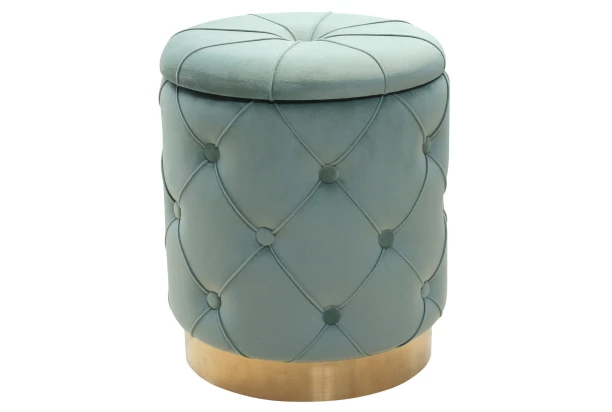Taburet v noblesním glamour vzhledu je očalouněn sametovou látkou v barvě zeleno-modrá aqua. Stylový design podtrhují okrasné knoflíky a zlatý kovový podstavec. U taburetu oceníte také praktický úložný prostor ukrytý pod sedákem.
