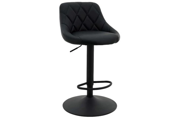 Barová židle s komfortní bederní opěrkou v zaobleném tvaru a okrasným kosočtvercovým proševem. Otočný sedák očalouněn ekokůží v barvě černá. Stabilní černá kovová konstrukce s podnožkou a možností výškového nastavování podle potřeby.