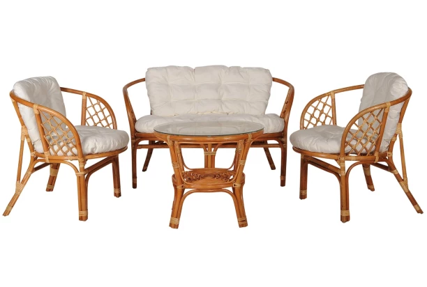 Set zahradního nábytku z přírodního ratanu obsahuje konferenční stolek, dvoumístnou pohovku a dvě křesla. Dopřejte si tak příjemné prostředí na nejen venkovní terase, ale i například v zimní zahradě vašeho domu. Včetně pohodlných polštářů.
