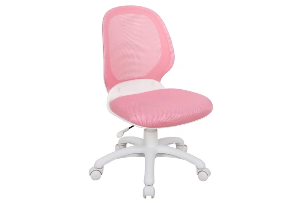 Moderní dětská židle k psacímu nebo PC stolu má bílou konstrukci vybavenou funkcí výškového nastavení. Očalouněna látkou ze síťoviny v barvě růžová.