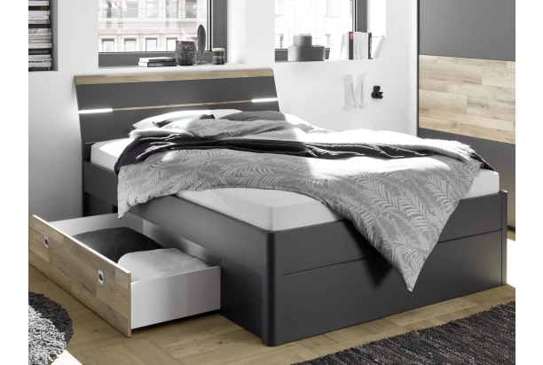 Postel o velikosti lůžka 140×200 cm se skvěle hodí i do prostoru malé ložnice. Vyrobena v kombinaci grafit/parketový dub. Oceníte vyšší konstrukci rámu pro snazší vstávání, dvě boční úložné zásuvky i zabudované osvětlení v čele postele.