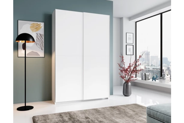Šatní skříň o šířce 125 cm a zmenšené hloubce 38 cm pasuje i do velmi malého prostoru – ideální využití také v chodbě nebo předsíni. Bílá skříň obsahuje police a výsuvnou šatní tyč.