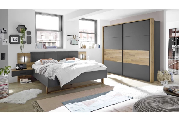 Šatní skříň s posuvnými dveřmi z kolekce Rivoli – nábytek v dřevodekoru parketového dubu s tmavým grafitem vnese do prostoru vaší ložnice nejen moderní styl, ale především teplo domova. Objemná skříň o šířce 270 cm nabízí 3 vnitřní úložné bloky s šatní tyčí a policí, v případě potřeby lze doplnit navíc o další police. K bočnímu rámu skříně lze připojit paspartový rám s LED osvětlením, které vytvoří intimní atmosféru během večera.