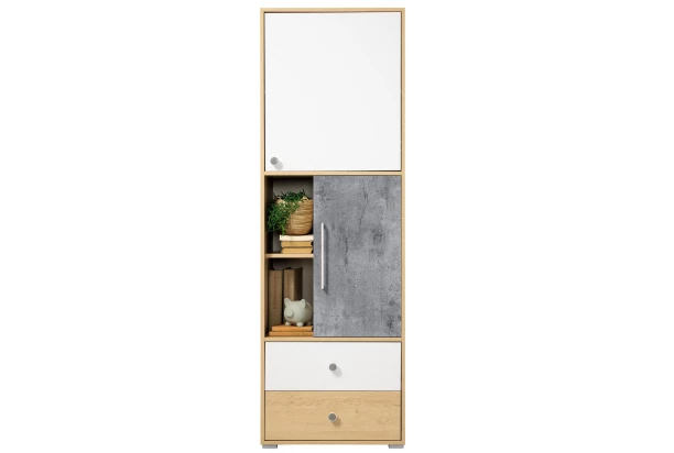 Vysoká skříňka se 2 přihrádkami z programu Step – nábytek v zajímavé kombinaci dřevodekoru dub/bílá/imitace šedý beton je ideální pro vybavení dětského i studentského pokoje, pro chlapce i pro dívky. Díky své univerzálnosti lze nábytek použít také do pracovny, kanceláře i obývacího pokoje.