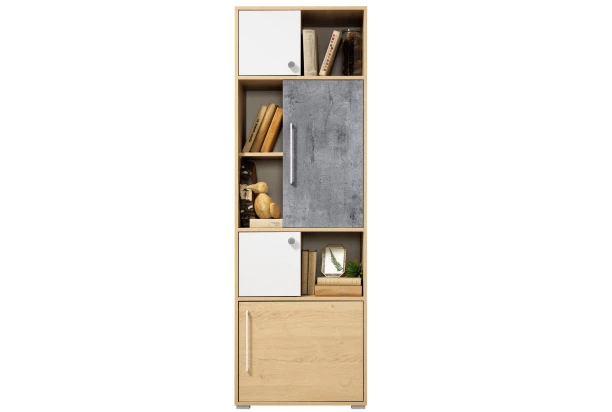 Vysoká skříňka se 4 přihrádkami z programu Step – nábytek v zajímavé kombinaci dřevodekoru dub/bílá/imitace šedý beton je ideální pro vybavení dětského i studentského pokoje, pro chlapce i pro dívky. Díky své univerzálnosti lze nábytek použít také do pracovny, kanceláře i obývacího pokoje.
