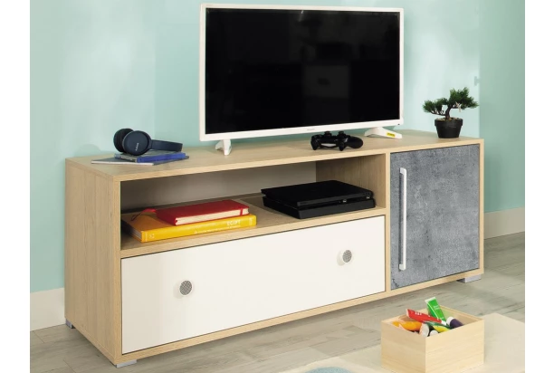 Televizní skříňka z programu Step – nábytek v zajímavé kombinaci dřevodekoru dub/bílá/imitace šedý beton je ideální pro vybavení dětského i studentského pokoje, pro chlapce i pro dívky. Díky své univerzálnosti lze nábytek použít také do pracovny, kanceláře i obývacího pokoje.